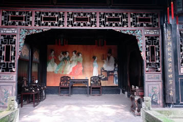 工字廳的正前方有一臺階。臺階上方是戲臺。臺前立柱上有一副對聯(lián):“移影換形儼然君臣父子,假哭真笑表達離合悲歡”,構(gòu)思精妙,立意深刻,無聲地向人昭示:這里是戲劇的天地。臺口左右華板上雕刻著《白蛇傳》中的“船舟借傘”和《西廂記中》的“鶯鶯聽琴”。人物形神畢現(xiàn),栩栩如生。臺前的落地罩精致絕倫,有關(guān)專家學(xué)者稱贊其“集中國民間傳統(tǒng)木雕之精華”,自是當(dāng)之無愧,其雕刻內(nèi)容,有歷史故事,如“黃道州發(fā)兵抗清”;有戲劇故事,如“別窯從軍”;有的取材于唐詩,如“尋隱者不遇”、“清明詩”等,有民間傳說,如“羊有跪乳之恩、烏有反哺之義”;有的采用諧音、象征手法表現(xiàn)美好的意愿的傳統(tǒng)圖案,如“掛印封候”、“富貴白頭”、“路路通順”等。