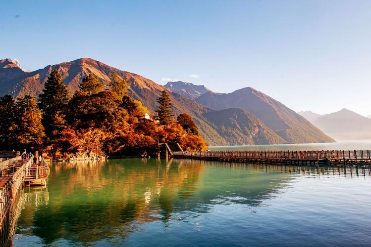 每到春季,湖四周群花爛漫,雪峰陣列并倒影湖中,景色宜人至極。秋季萬山紅遍,層林盡染,天空碧藍(lán)如洗,火紅的楓葉折射燦爛的陽光,倒影在碧藍(lán)的湖面,景色美不勝收。