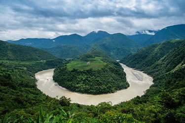 從空中或從西興拉等山口鳥瞰大峽谷,在東喜馬拉雅山無數(shù)雪峰和碧綠的群山之中,雅魯藏布江硬是切出一條筆陡的峽谷,穿越高山屏障,圍繞南迦巴瓦峰作奇特的大拐彎,南瀉注入印度洋,其壯麗奇特?zé)o與倫比。