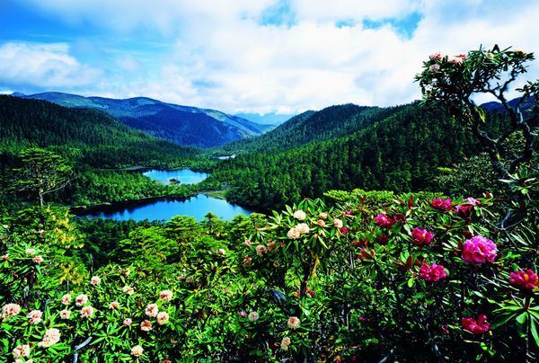 老君山風(fēng)景區(qū)山中的確有九十九個冰蝕湖,而且每個湖又呈現(xiàn)出不同的色彩和姿態(tài),與童話般的“九寨溝”相比,它更多了一分大氣、少了一分矯情。特別在每年的5、6月,漫山的花在純凈得幾乎透明的天空下開放了,遠遠看去,就像是一張五彩的草甸。