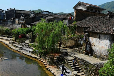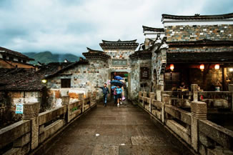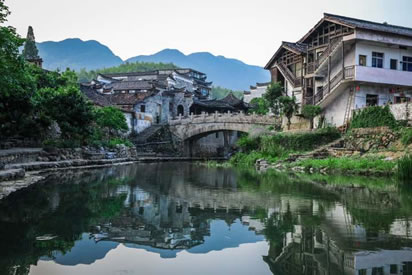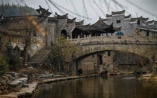 小橋如虹霓跨溪,上面長(zhǎng)滿了綠藤,橋下水聲依依,站在不遠(yuǎn)處的水埠上,半圓的橋拱與水中的倒影正好構(gòu)成了一個(gè)圓,水波蕩漾,恍如一輪圓月,此景被叫做“楓溪望月”確是名不虛傳。
