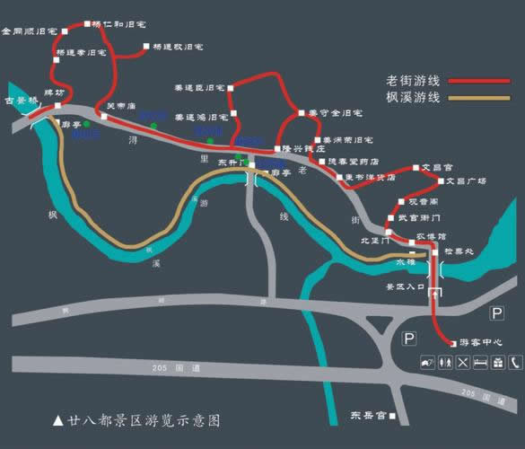 古鎮(zhèn)舊有東西南北四道城門,今唯有鎮(zhèn)南石質(zhì)門額一方,書有“楓溪鎖鑰”。一條街道與小溪并行,自北至南曲折蜿蜒長(zhǎng)達(dá)1公里。兩旁多為二層樓店鋪?zhàn)鞣,基本保持?9世紀(jì)集鎮(zhèn)的風(fēng)貌。